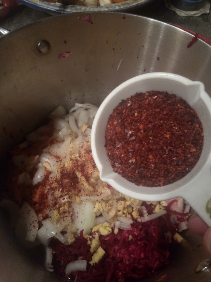 1-4 oz of ‘korean chili flakes’, also called ‘gochugaru’. If you don’t have a korean grocery near you, you may need to source this on the internet. DO NOT UNDER ANY CIRCUMSTANCES USE the regular American chili flakes such as might be found in a shaker bottle at a pizza restaurant next to the parmesan cheese, doing this will make the kim chi bad, and wrong.