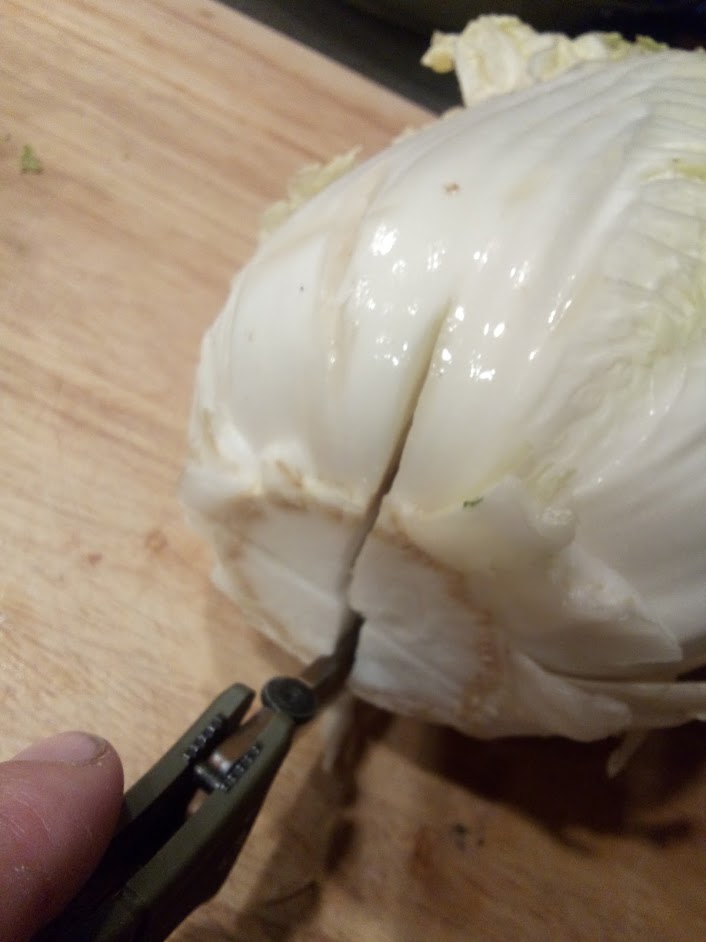 Remove any brown or otherwise nasty outer leaves from the cabbage. Then, with a knife of your choice, cut a nice little cross through the base like shown here: