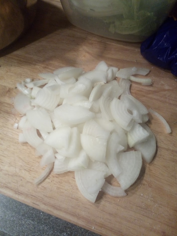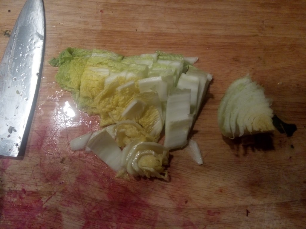 All this time you have been remembering to TURN the cabbages every half hour or so, but it probably didn’t take you two hours to make the paste mixture, so now you might have to wait until the cabbages are fully salted. Engage in whatever behaviors you choose, but DO NOT SIN. After two or three hours of turning the cabbages over every 30-40 minutes and basting them in the salty liquid that drips off, you can now chop up the cabbage.