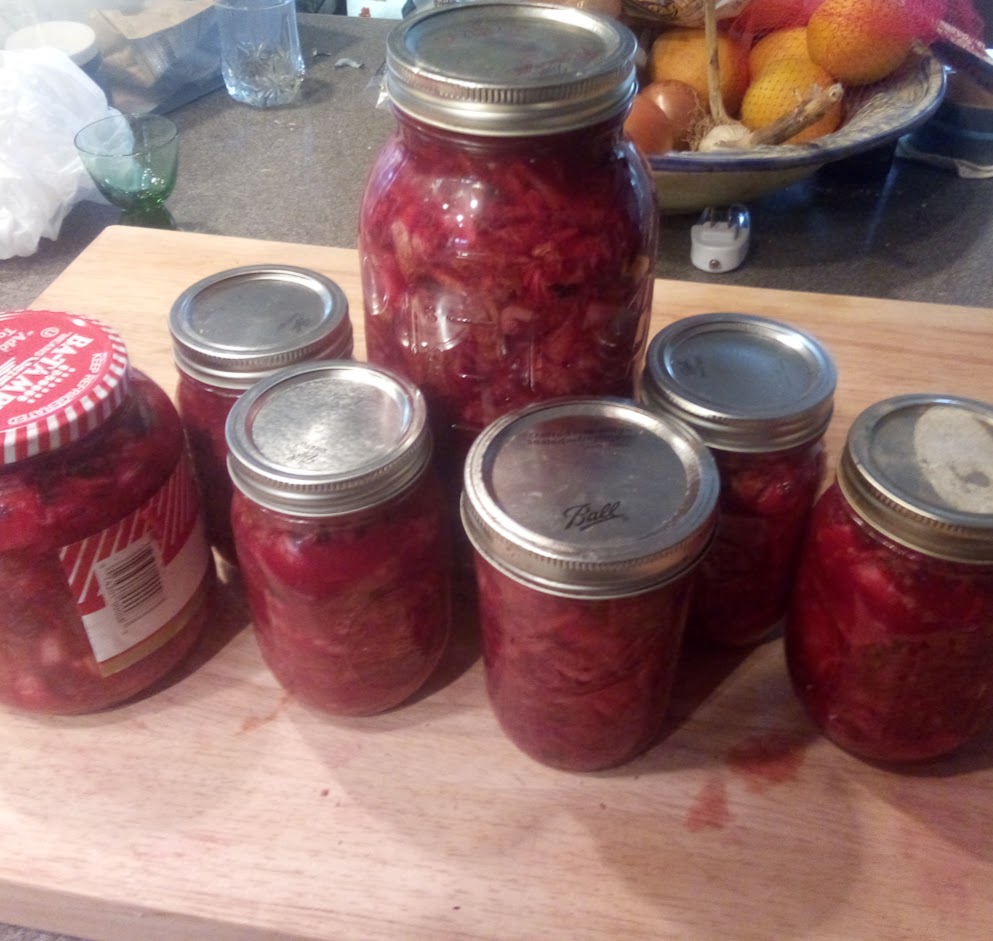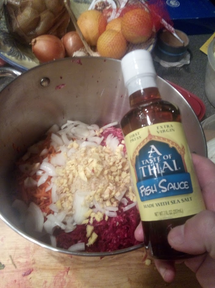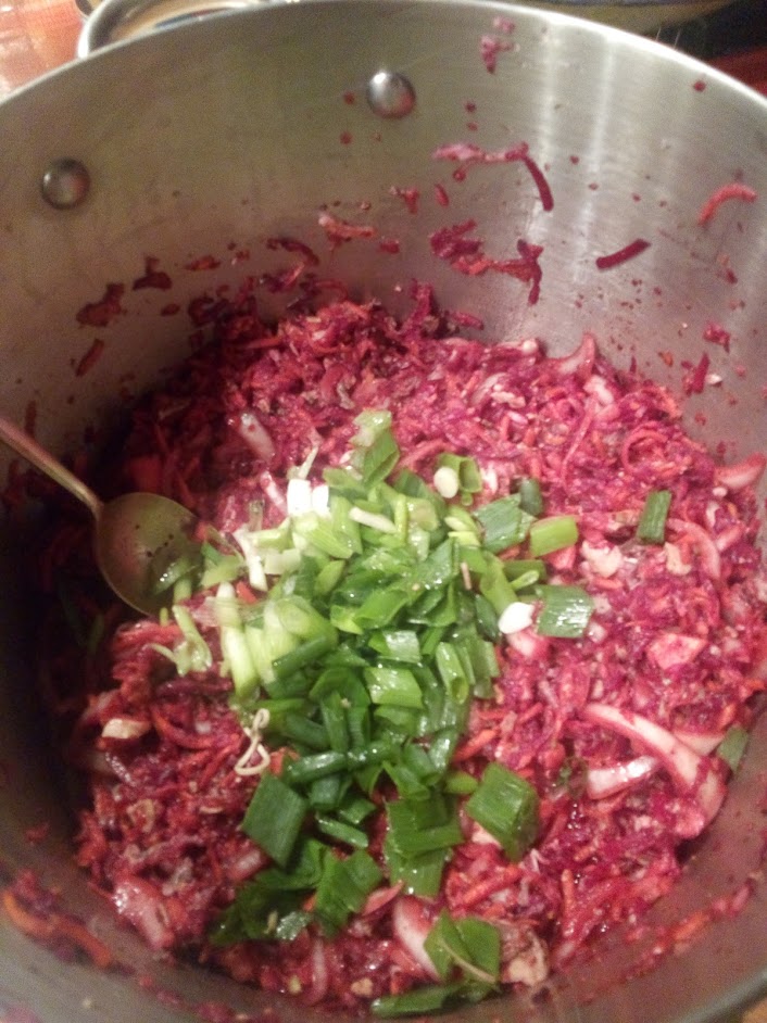 Carrots, beets, and radishes. Here are mine all shredded up good in a big pot: