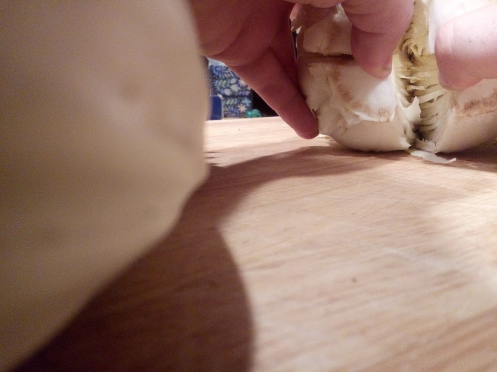 As you can see, I have cut straight through the base of the cabbage, then rotated it 90 degrees and done it again. This allows me to shove my thumbs in the hole and pull the cabbage into halves, as shown below at an awkward angle: