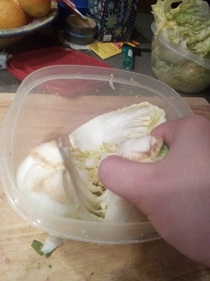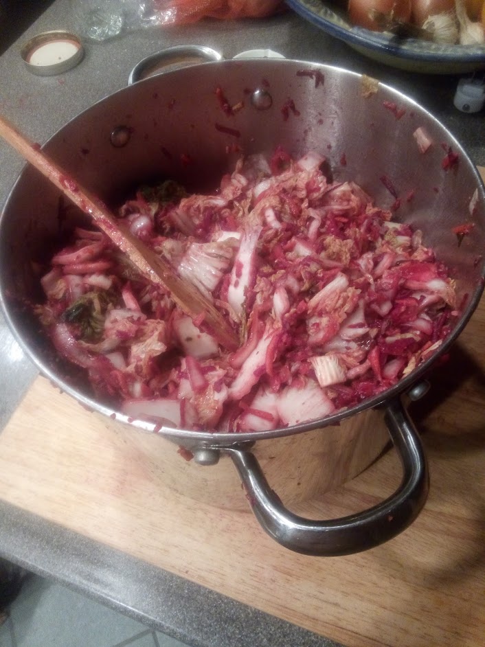 All of the salting of the cabbages and the salt content of the fish sauce have created an inhospitable environment for most of the evil influences present in the American home (the powers and principalities of the AIR), but left a welcoming environment for our beloved lactobacillus bacteria (benevolent cthonic spirits). We can now safely fill jars or other containers with this fresh kim chi and over the next days and weeks it will ferment into the end product that we desire.