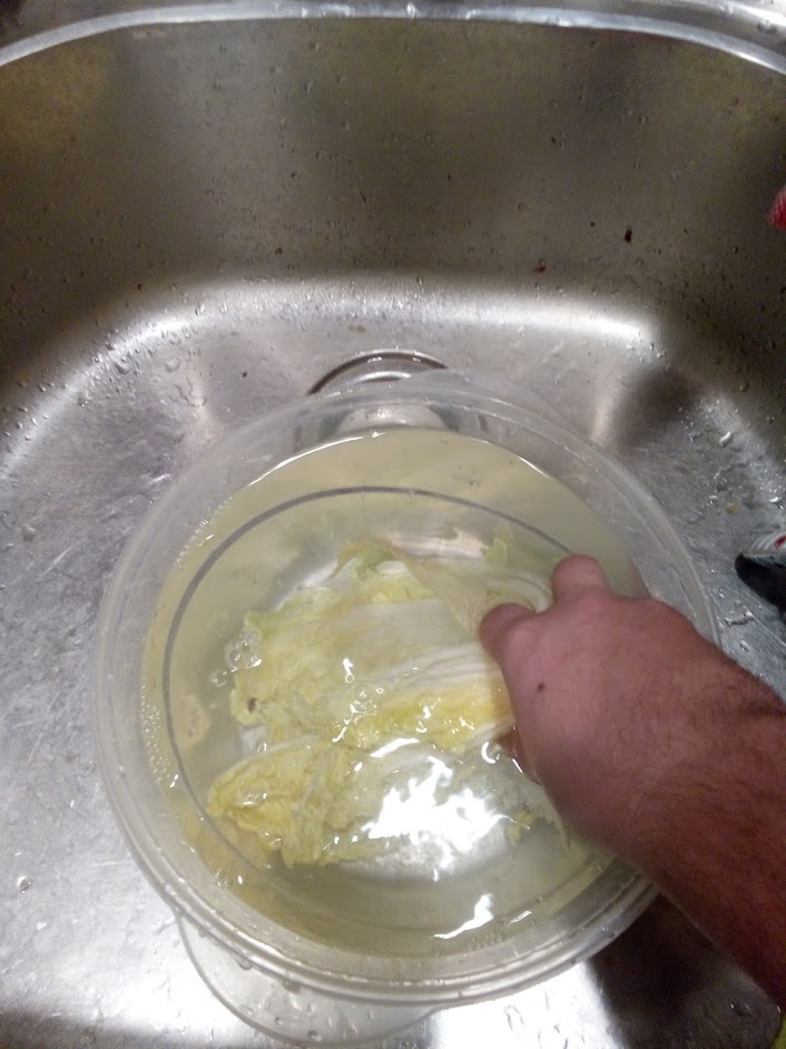 Next, wash the cabbage. I like to fill a big basin with water and just submerge and dunk them until all the salt has been washed from between the leaves. They will be all floppy and wet and drippy now.
